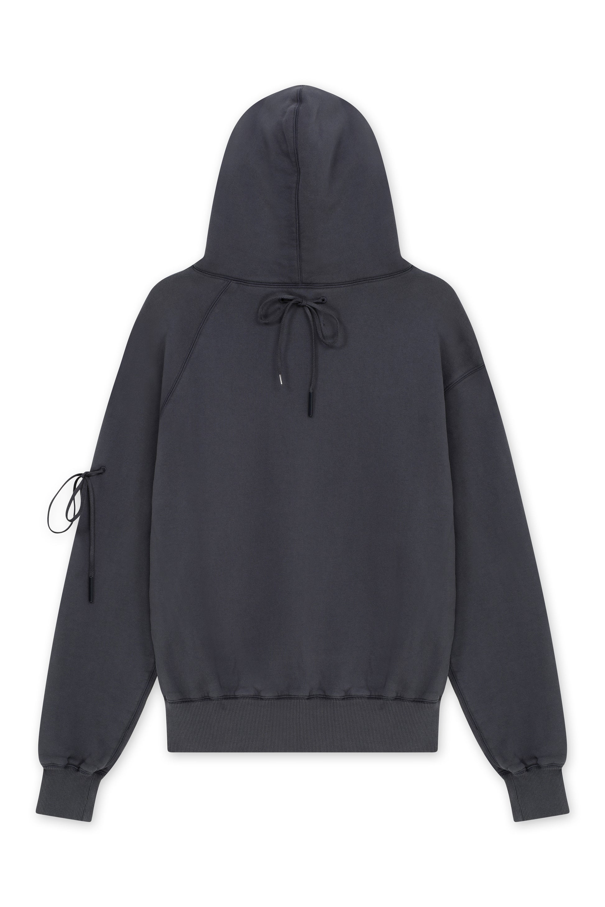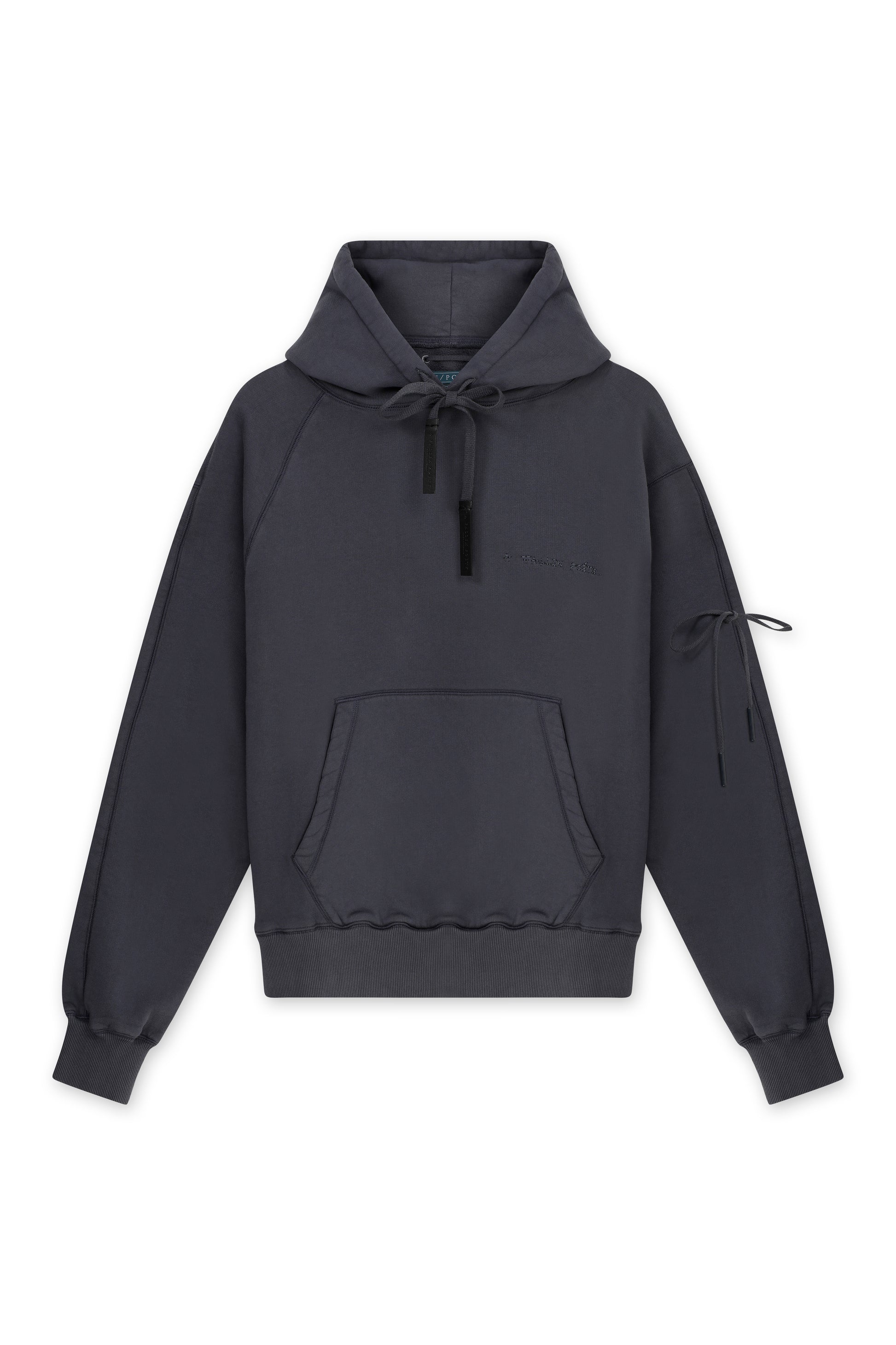 Description: Long sleeve, heavyweight 495gsm hoodie made with BCI certified recycled cotton in washed gravel colour. Drawstring at hood. Hand stitched embroidery at chest in off white. Kangaroo pocket at waist. Rib knit cuffs and hem. AFP signature tie detail to left sleeve and back neck both of which can be worn in multiple forms or removed completely only leaving visible stitched eyelets. Every garment comes with 2 tonal laces with tonal caps, 2 ecru (natural colour) laces with tonal caps and 2 black laces with tonal caps for mixing and matching. Marques is 6ft 4 and wearing a size Large.