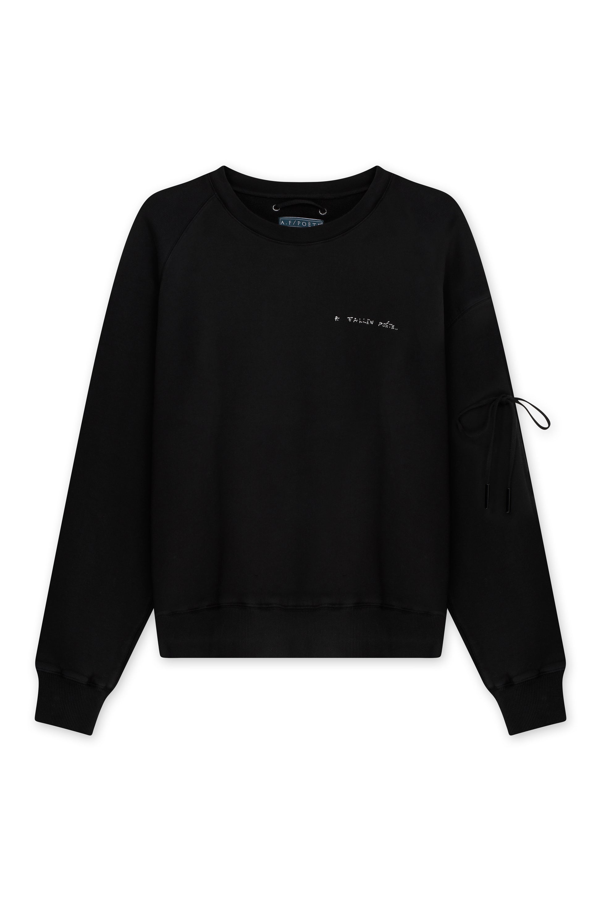 DESCRIPTION: LONG SLEEVE, HEAVYWEIGHT 495GSM CREWNECK SWEATSHIRT MADE WITH BCI CERTIFIED RECYCLED COTTON GARMENT DYED IN A WASHED BLACK COLOUR. HAND STITCHED EMBROIDERY ON CHEST IN OFF WHITE COLOUR. RIB KNIT CUFFS AND HEM. AFP SIGNATURE TIE DETAIL TO LEFT SLEEVE AND BACK NECK BOTH OF WHICH CAN BE WORN IN MULTIPLE FORMS OR REMOVED COMPLETELY ONLY LEAVING VISIBLE STITCHED EYELETS. EVERY GARMENT COMES WITH 2 TONAL LACES WITH TONAL CAPS, 2 ECRU (NATURAL COLOUR) LACES WITH TONAL CAPS AND 2 BLACK LACES WITH TONAL CAPS FOR MIXING AND MATCHING. MARQUES IS 6FT 4 AND WEARING A SIZE LARGE.