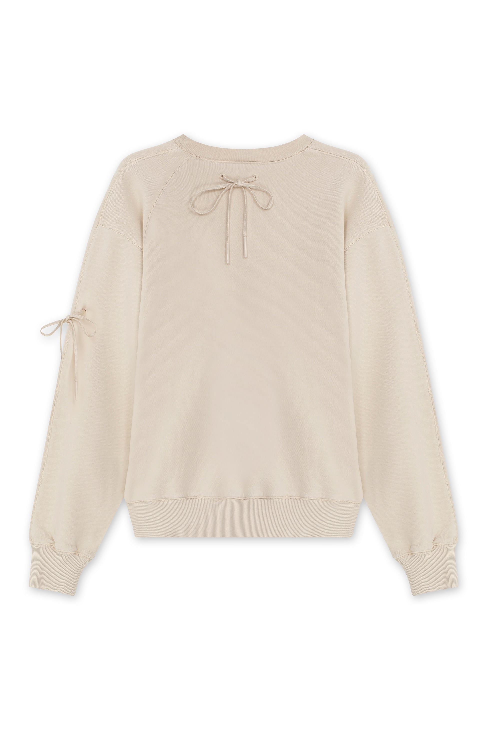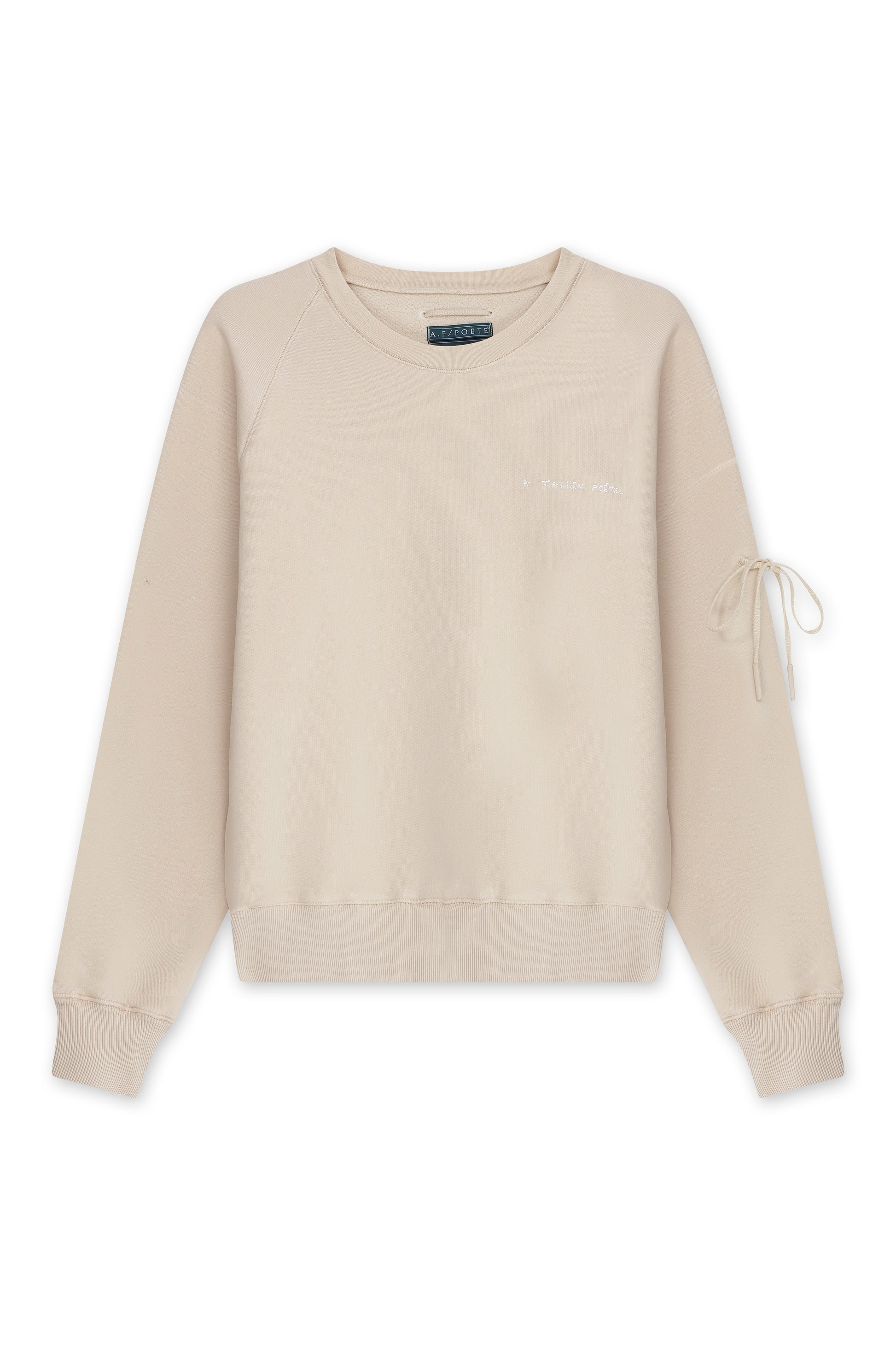 DESCRIPTION: LONG SLEEVE, HEAVYWEIGHT 495GSM CREWNECK SWEATSHIRT MADE WITH BCI CERTIFIED RECYCLED COTTON GARMENT DYED IN A WASHED ECRU COLOUR. HAND STITCHED EMBROIDERY ON CHEST IN OFF WHITE COLOUR. RIB KNIT CUFFS AND HEM. AFP SIGNATURE TIE DETAIL TO LEFT SLEEVE AND BACK NECK BOTH OF WHICH CAN BE WORN IN MULTIPLE FORMS OR REMOVED COMPLETELY ONLY LEAVING VISIBLE STITCHED EYELETS. EVERY GARMENT COMES WITH 2 TONAL LACES WITH TONAL CAPS, 2 ECRU (NATURAL COLOUR) LACES WITH TONAL CAPS AND 2 BLACK LACES WITH TONAL CAPS FOR MIXING AND MATCHING. MARQUES IS 6FT 4 AND WEARING A SIZE LARGE.