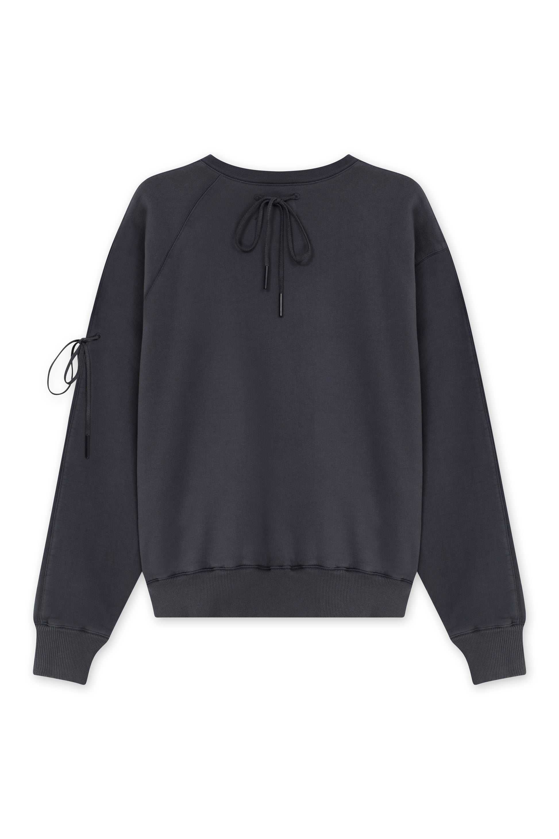 DESCRIPTION: LONG SLEEVE, HEAVYWEIGHT 495GSM CREWNECK SWEATSHIRT MADE WITH BCI-CERTIFIED RECYCLED COTTON GARMENT DYED IN A WASHED ECRU COLOUR. HAND-STITCHED EMBROIDERY ON CHEST IN OFF-WHITE COLOUR. RIB KNIT CUFFS AND HEM. AFP SIGNATURE TIE DETAIL TO LEFT SLEEVE AND BACK NECK BOTH OF WHICH CAN BE WORN IN MULTIPLE FORMS OR REMOVED COMPLETELY ONLY LEAVING VISIBLE STITCHED EYELETS. EVERY GARMENT COMES WITH 2 TONAL LACES WITH TONAL CAPS, 2 ECRU (NATURAL COLOUR) LACES WITH TONAL CAPS AND 2 BLACK LACES WITH TONAL CAPS FOR MIXING AND MATCHING. MARQUES IS 6FT 4 AND WEARING A SIZE LARGE.
