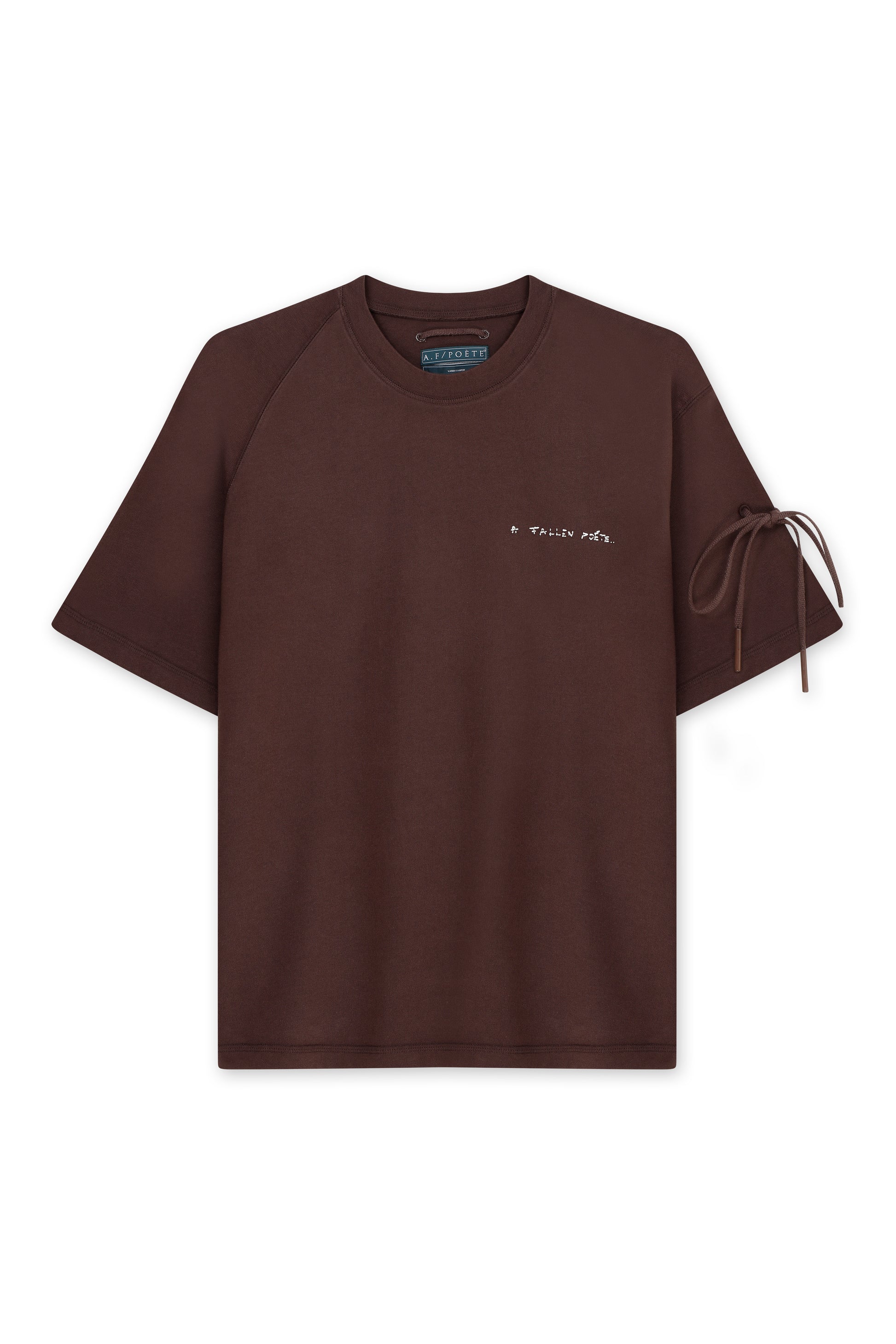 Short sleeve, midweight crewneck tee made with organic cotton, weighing 195 gsm, in a washed brown colour. Hand-embroidered detailing on the back in tonal thread. Rib knit collar for a comfortable fit. AFP signature tie detail on the left sleeve and back neck, both of which can be worn in multiple forms or removed entirely, leaving visible stitched eyelets. Each garment comes with 2 tonal laces with matching caps, 2 ecru (natural colour) laces with tonal caps, and 2 black laces with tonal caps for mixing and matching. Marques is 6ft 4 and wearing a size Large.