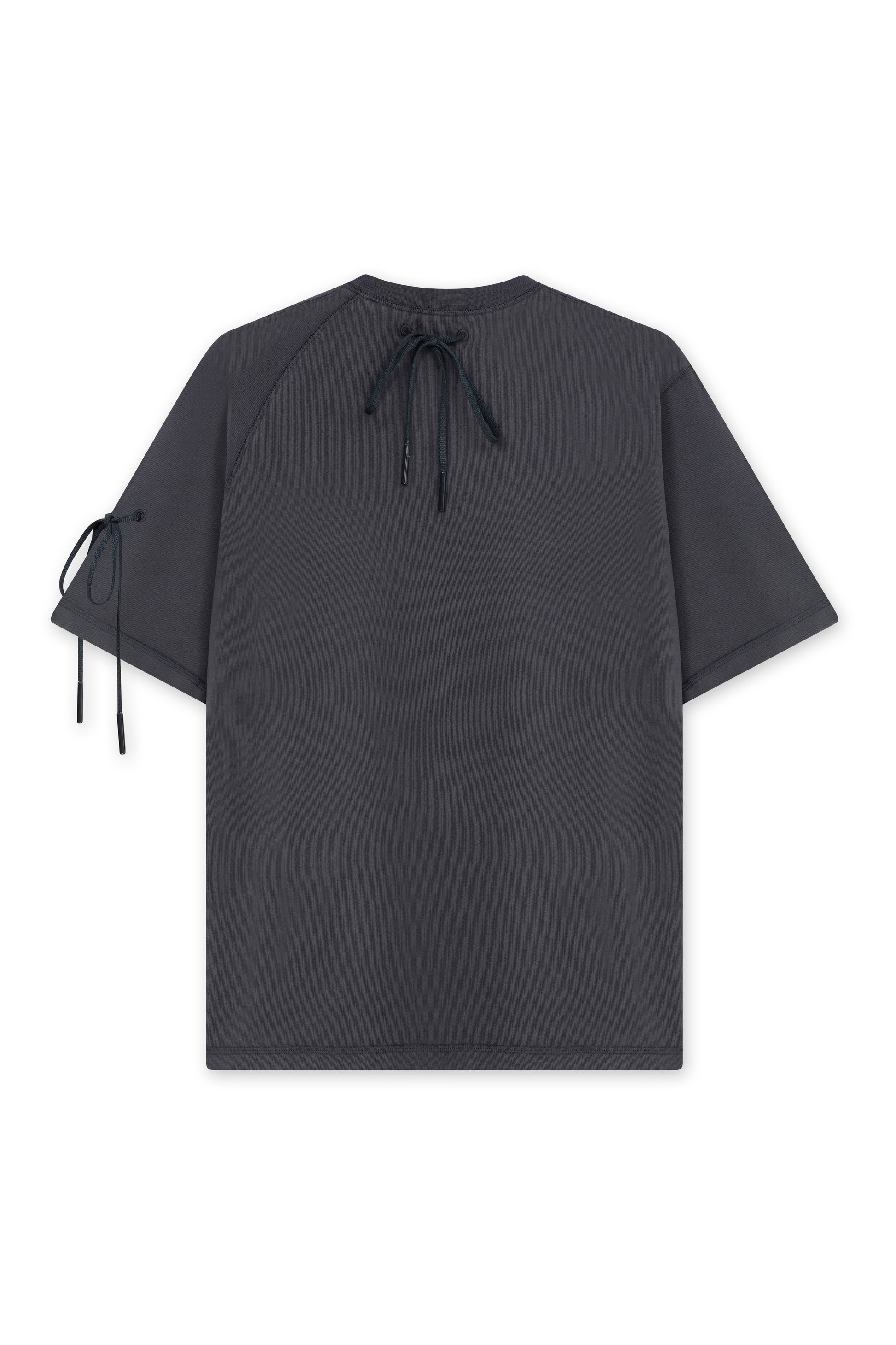 Short sleeve, midweight crewneck tee made with organic cotton, weighing 195 gsm, in a gravel colour. Hand-embroidered detailing on the back in tonal thread. Rib knit collar for added comfort and durability. AFP signature tie detail on the left sleeve and back neck, both of which can be styled in multiple ways or removed entirely, leaving visible stitched eyelets. Each garment comes with 2 ecru laces with matching caps and 2 black laces with tonal caps for versatile styling options. Marques is 6ft 4 and wearing a size Large.
